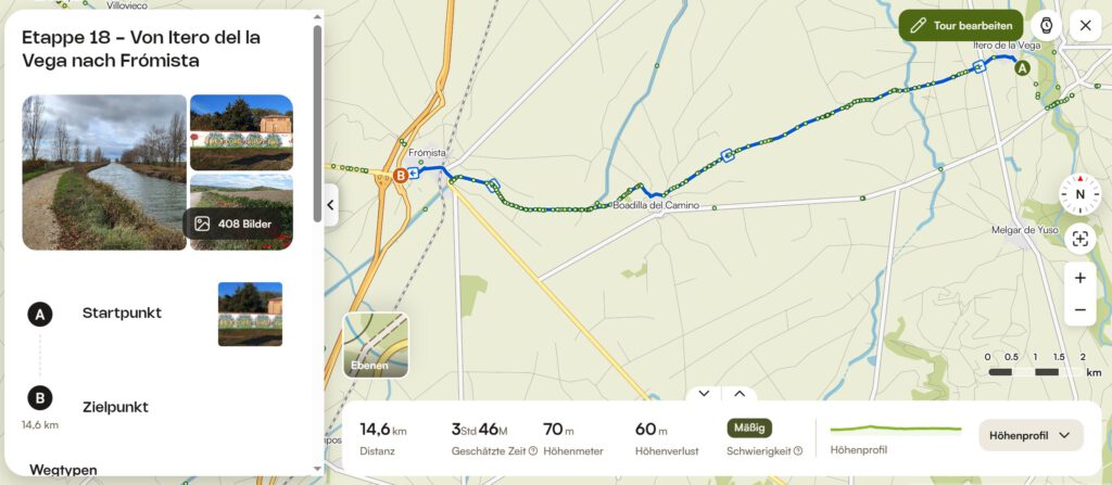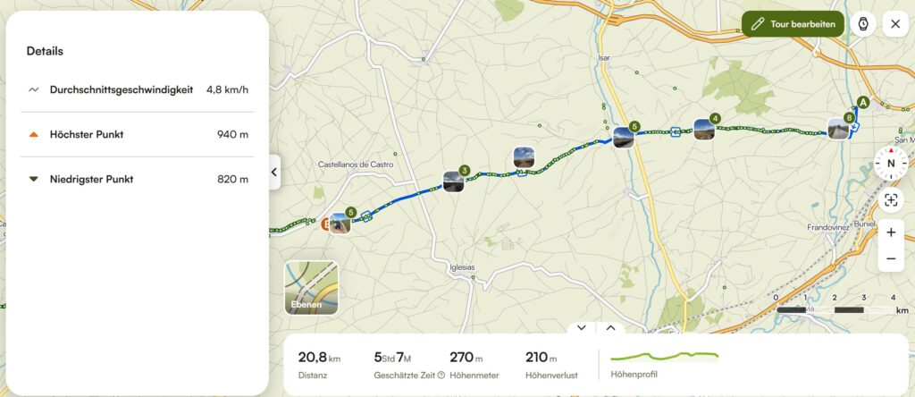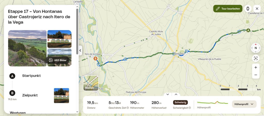 Heute gab es 2 Routen. Zum einen ist Xiangyang mit unserem Sprinter von Campingplatz in Burgos zu meinem Startpunkt in Tardajos gefahren und zu meinem Endpunkt in Hontanas. Ich selbst bin ich auf dem Jakobsweg 20,8km gepilgert, von Tardajos nach Hontanas.