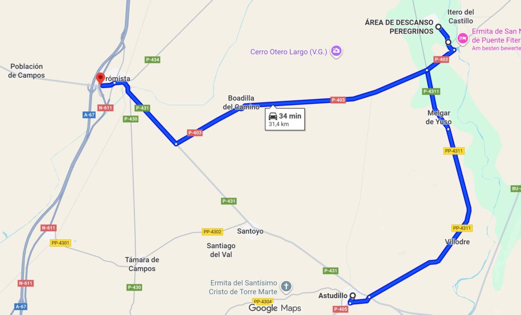 Vom Etappenziel in Itero de la Vega sind wir dann mit dem Sprinter noch ca. 14 km in den Ort Astudillo zum Übernachten auf dem Gratis Stellplatz dieser Gemeinde gefahren. Xiangyang bringt mich dann morgen wieder zurück zum heutigen Etappenziel in Itero de la Vega, damit ich von da aus die nächste Etappe angehen kann.