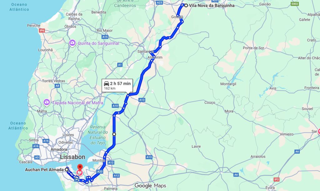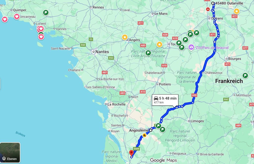 Da wir Mautfrei unterwegs sind hat Google für diese Distanz ungefähr 5 1/2 Stunden genannt. Mit Mittagspause, einkaufen bei Leclerc sowie einem Tankstopp sind es dann doch 7.5 Stunden Reisezeit geworden.