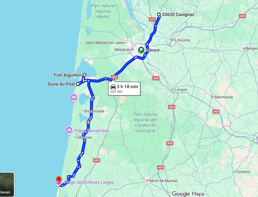 Vom Wohnmobil Stellplatz in Cavignac ging es zum Fischgeschäft in Arcachon. Von dort noch ein Stück zur großen Dünne Dune du Pilat und dann noch ca 112 km südwärts an den Plage de Moliets .