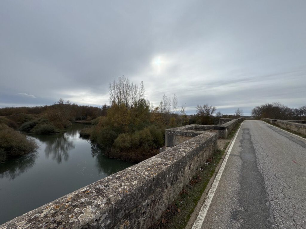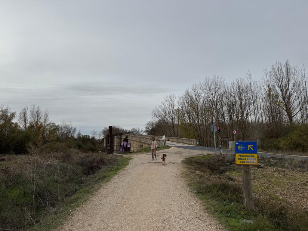 Auch dieser Abschnitt ging irgendwann vorüber und ich befand mich erneut auf der Zielgeraden zu einem Etappenziel. Ca. 1.5 km vor diesem empfing mich meine liebe Frau Xiangyang und mein Hund Leo. Bis zum Ziel in Itero de la Vega selbst war es dann nur noch etwas mehr als 1 km. Es ging auf einer alten Steinbrücke über den Rio Pisuerga. Dort betrat ich nun die Provinz Palencia. Die Provinz Burgos hatte ich nun verlassen. Burgos und Palencia gehören beide zur Autonomen Region Kastilien und Leon.