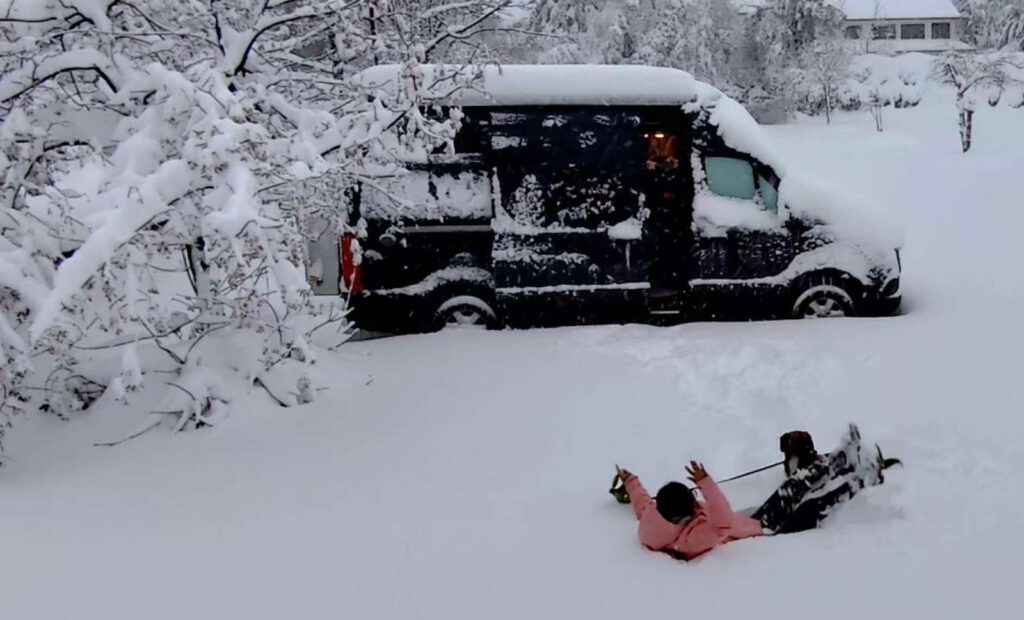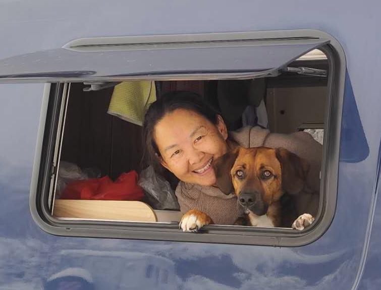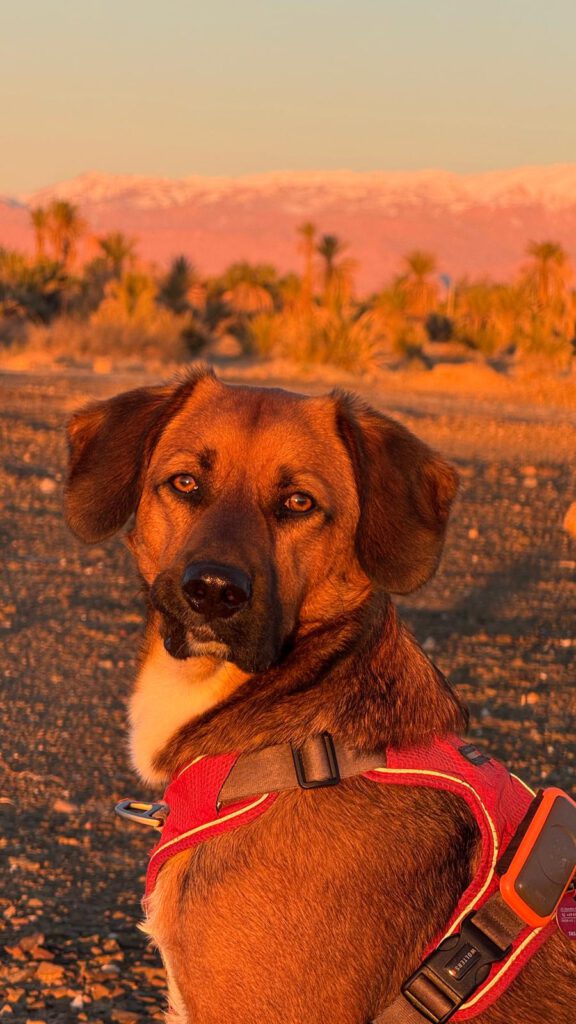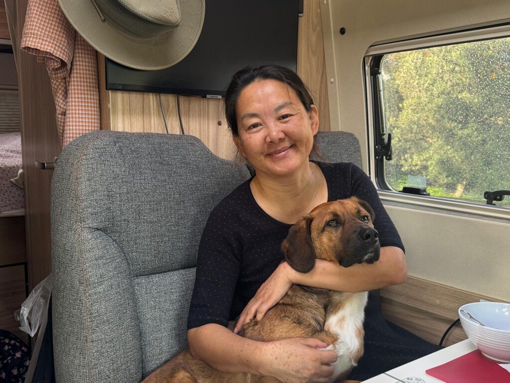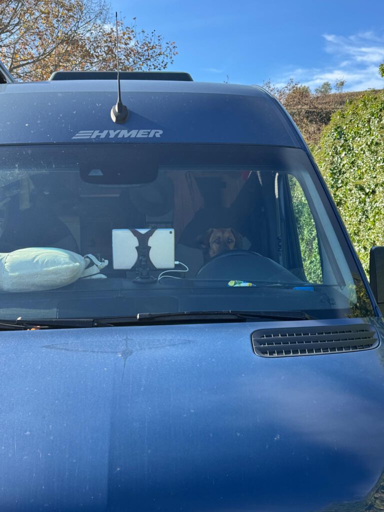 Wie auch immer der Morgen startete völlig anders als gedacht. Xiangyang kam gegen 8:45 Uhr von ihrer Gassi Runde zurück und Leo war gerade in den Sprinter gesprungen, Pfoten geputzt, Geschirr mit Tracker ausgezogen als er in einem unbeobachteten Moment aus dem Sprinter sprang und in Richtung eines Border Collies, welcher einem anderen Camper gehörte, rannte. Da dieser aber kein Interesse an Leo hatte machte sich Leo auf um das Weite zu suchen. Kein Rufen konnte ihn zur Umkehr bewegen.