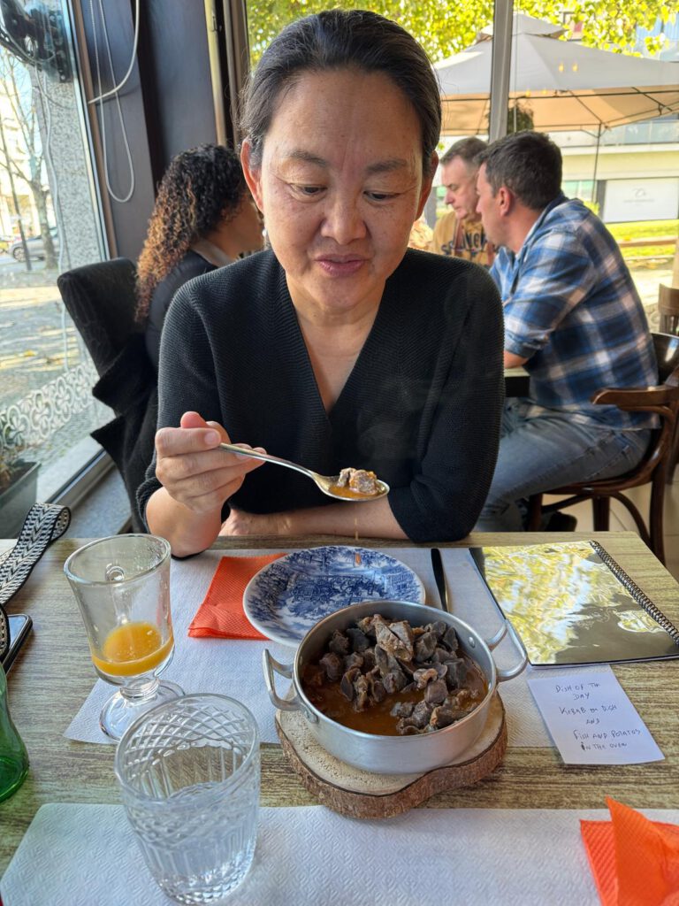 Zurück am Sprinter habe ich mich dann in Schale geschmissen ( Sweatshirt anstelle kurzärmligen Hemd ) und habe Leo für 2 bis 3 Stunden alleine, als Wachhund, im Camper zurückgelassen. Mein Ziel war dann wieder die Altstadt. Xiangyang hatte mir mit WhatsApp die Adresse eines sehr schönen und gemütlichem Restaurant geschickt. Dort hatte sie einen Platz reserviert und mich zu einem leckeren Abendessen mit typischen Brügge Gerichten eingeladen. Sie wählte Miesmuscheln Brügge Art und für mich ein belgisches Gulasch mit den typischen belgischen Pommes. Pommes wird hier zu allem möglich gereicht. Nudeln und Reis ist hier wohl nicht so gefragt. Auf jeden Fall kann ich jetzt für eine Weile keine Pommes mehr sehen.