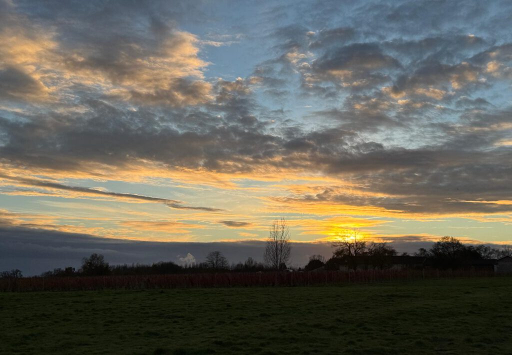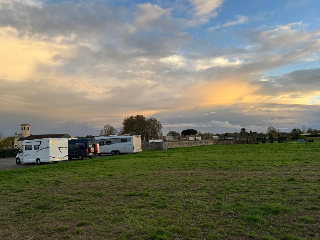Stellplatz im Dörfle Outarville heute Morgen um 7:30 Uhr, Zwischenstopp in Angouleme mit seinen Comic Graffities, Stellplatz in Cavignac neben den Weinfeldern.