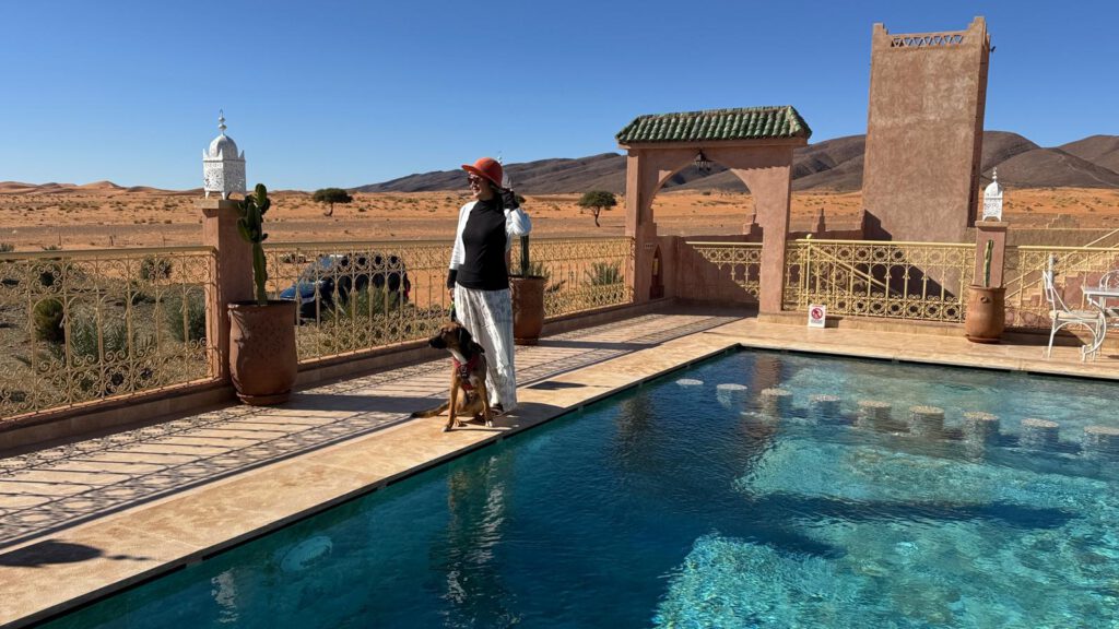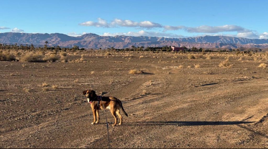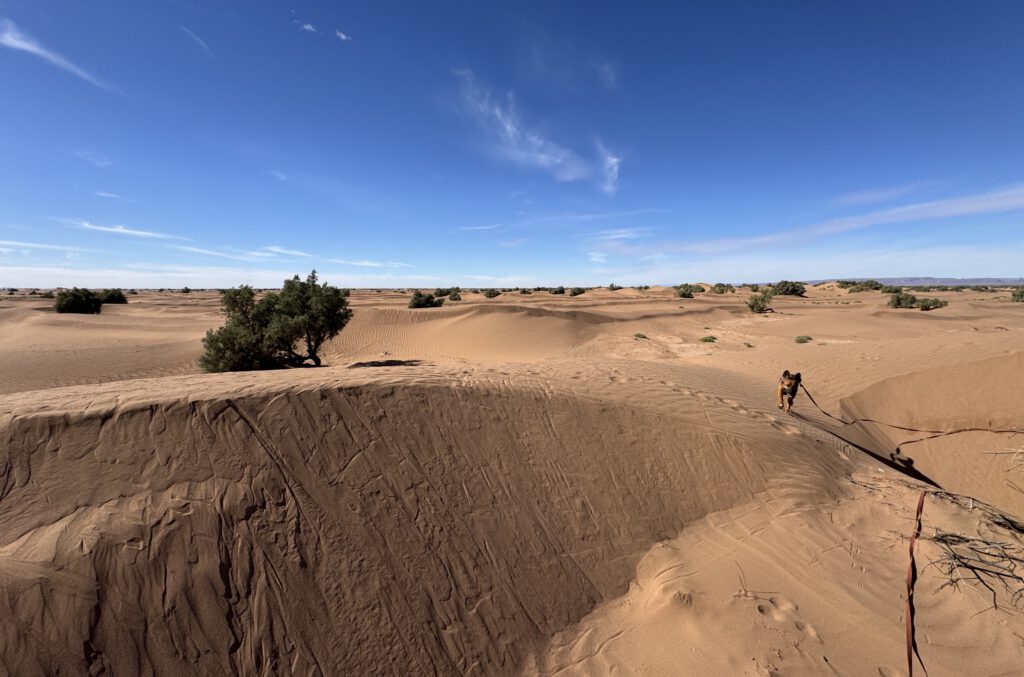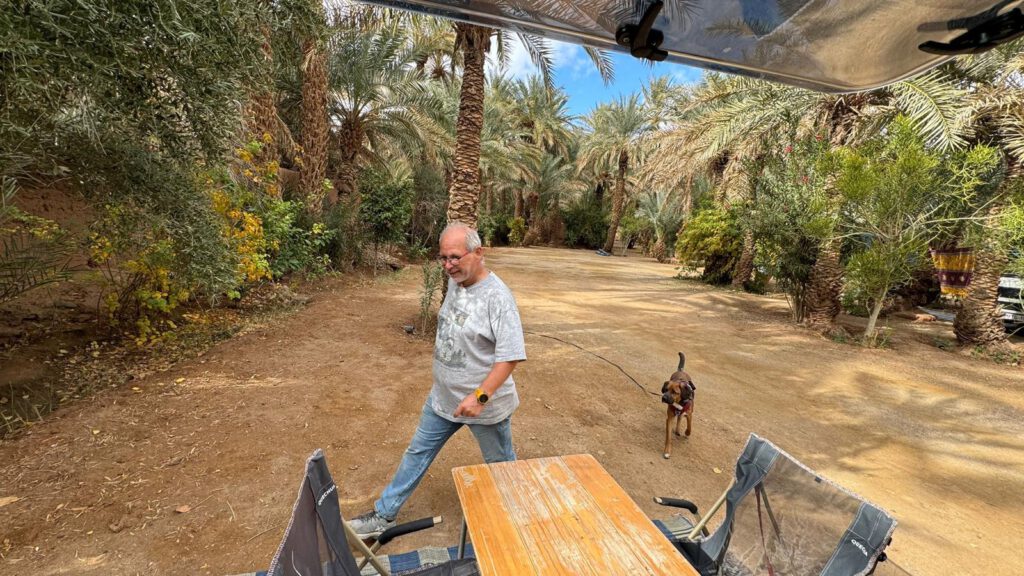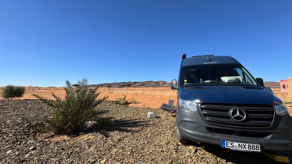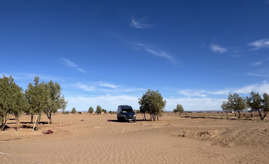 Das Camp liegt direkt an der 4*4 Route durch die Wüste nach Foum Zguid, die wir 2021 als Testfahrt mit unserem Ford Ranger geplant hatten. Allerdings scheint mir diese Strecke nun mit unserem Sprinter wohl nicht möglich zu sein. Zu viele Tiefsand Passagen sind schon zu Beginn dieser ca. 130 km langen Strecke zu meistern. Mit anderen zusammen würden wir es wagen aber alleine scheint uns das doch zu spannend zu werden.