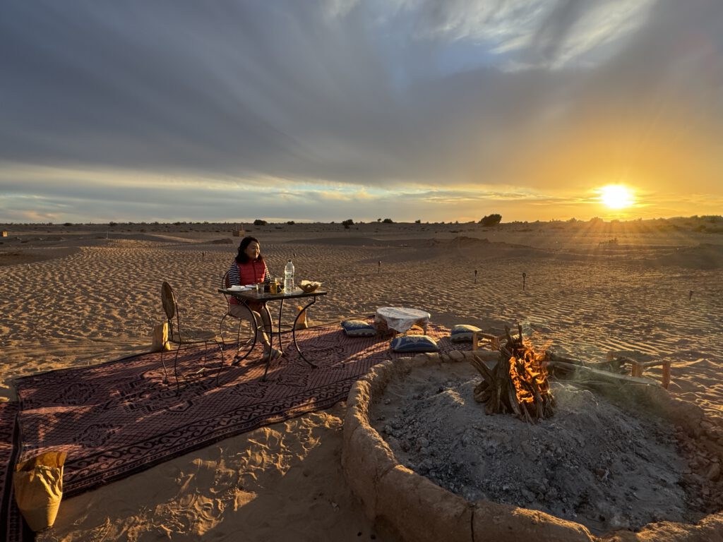 Am Abend hatten wir zum Sonnenuntergang am Feuer ein typisches Marokkanisches Essen. Tangine mit Huhn. Für die einfachen Möglichkeiten hier im Camp war es ganz ok. Eine leckerer Schweinebraten mit Knödel und einem Weizen nach nunmehr 47 Tagen wäre schon besser gewesen….😂.