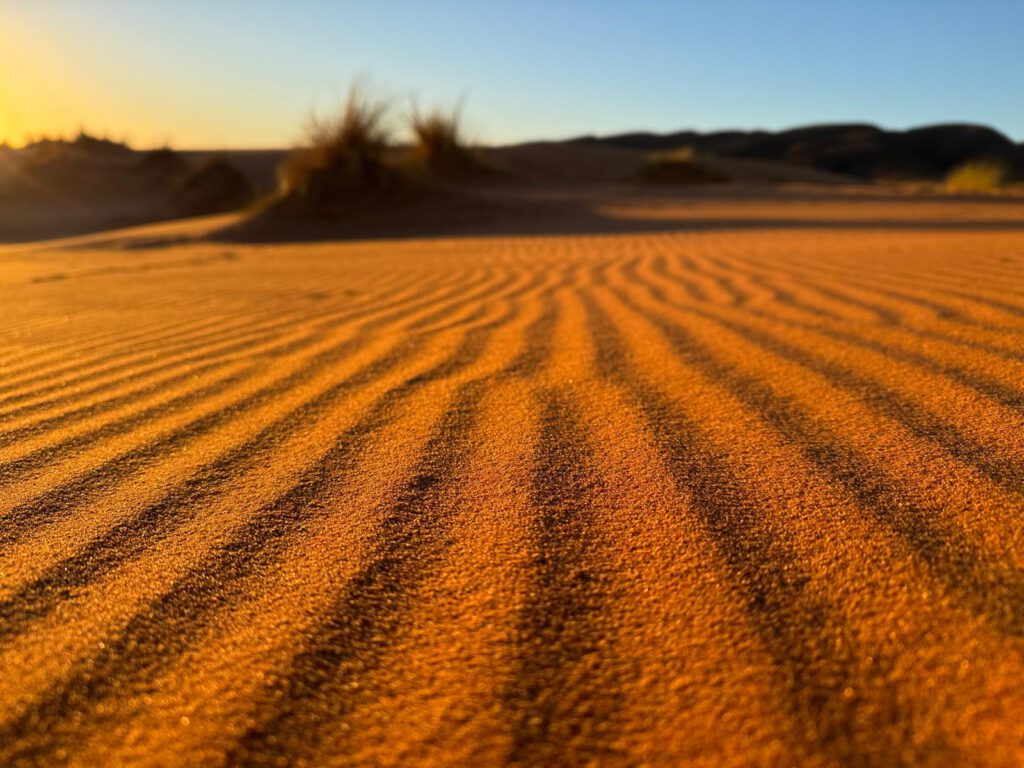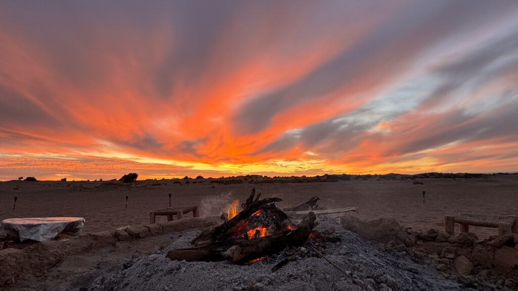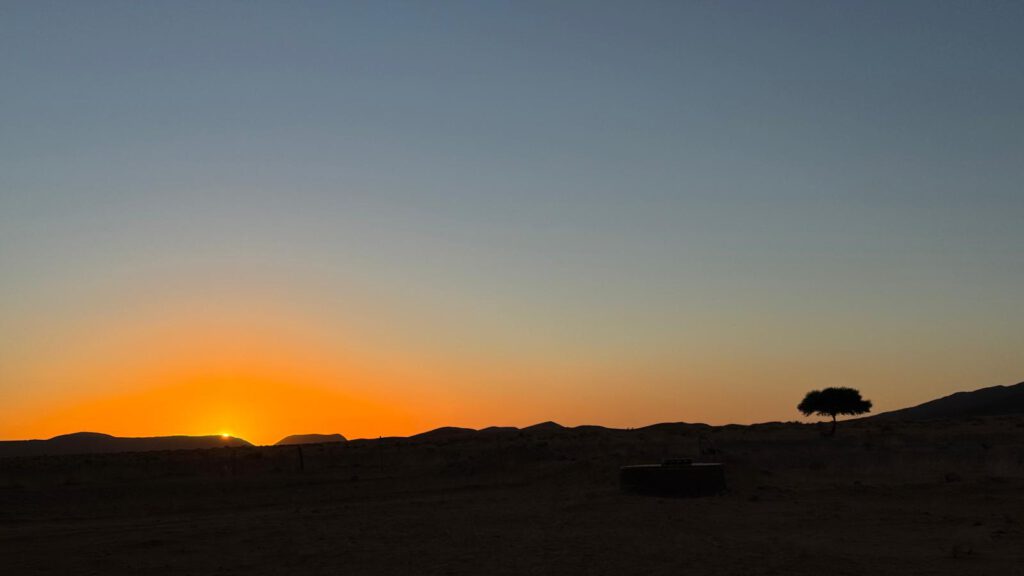 Das Camp ist sehr einfach gehalten und man sollte ein Autarkes Fahrzeug besitzen da es weder Strom noch Toiletten Entsorgung gibt. Dafür aber herzlichen Empfang, schöne Sandplätze mit einem Teppich vor dem Auto und tollen Ausblick auf die Sanddünen.