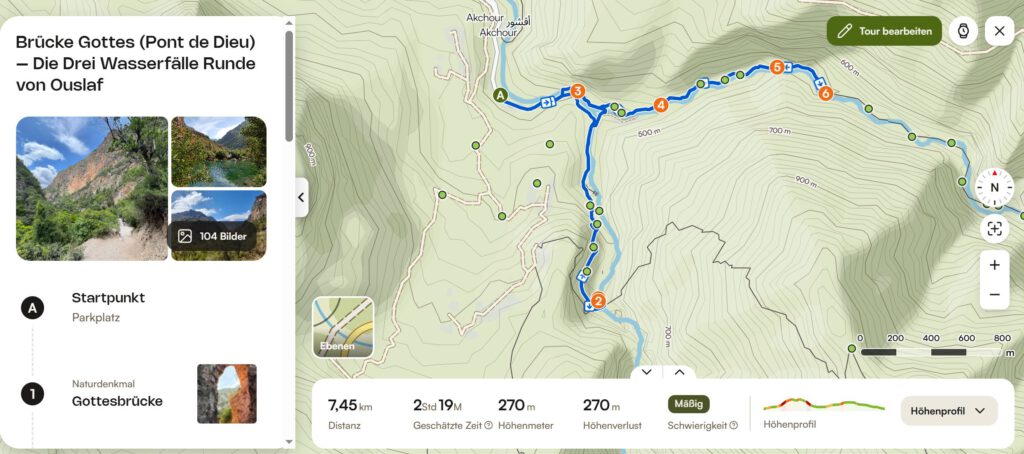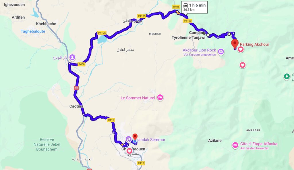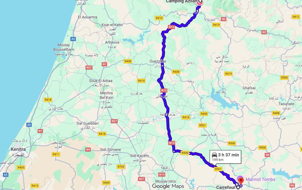 Fahrt: Vom Campingplatz Tizmoutine ging es zuerst nach Tinghir zur Shell Tankstelle dann weiter zum Carrefour. Von dort direkt in die Todra Schlucht und hoch zur Schranke beim Taghrot Guesthouse. Dann zurück wieder über Tinghir in die Dades Schlucht zum Campingplatz Ait Oudinar. Fahrtstrecke 204 km