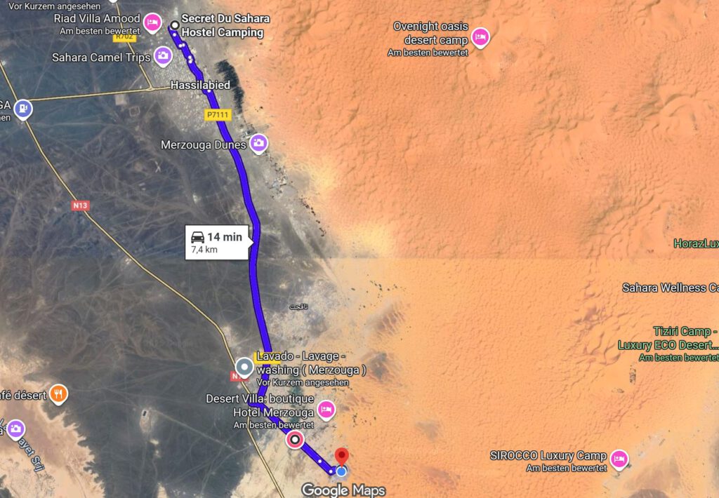 Fahrt: Vom lauten La Gazelle Bleue in Merzouga zum ruhigen Desert Camp Porte De Sahara in Ouzina