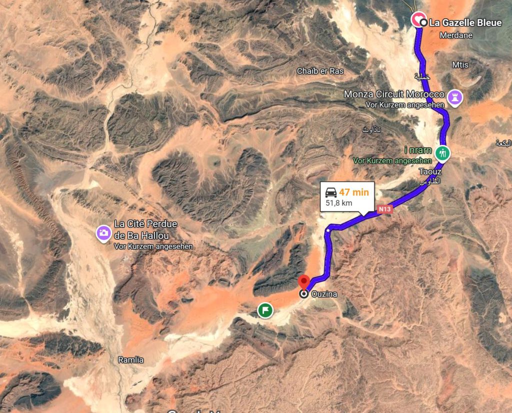 Fahrtstrecke: Vom Desert Camp Porte De Sahara zum Restaurant und Museum des Oasis Ksar Elkhorbat und weiter zum Campingplatz Tizmoutine. Die heutige Fahrtstrecke betrug laut Google 222km….