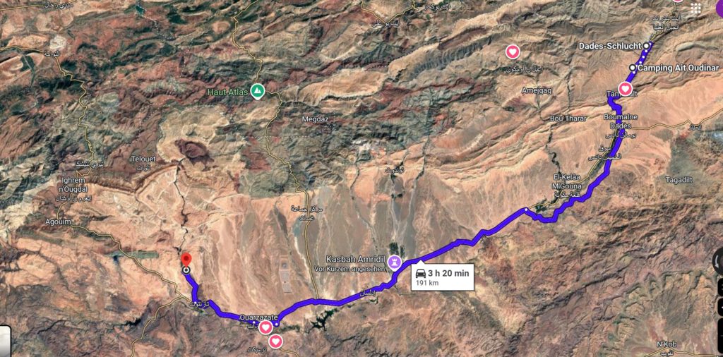 Fahrt: Vom Camping Ait Oudinar ging es noch ca. 10 km weiter um auch durch die eigentliche dades Schlucht zu kommen. Danach ging es zurück an den Talanfang und weiter durch Ouarzazate nach Aït-Ben-Haddou, Marokko. Insgesamt ca. 191km.