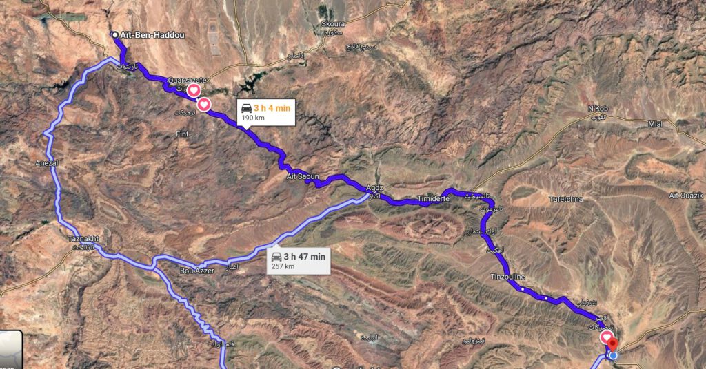 Fahrt: von Aït-Ben-Haddou über Ouarzazate und Agdz ging es nach Zagora zum Camping Oasis Palmier. Eine Strecke von 190 km