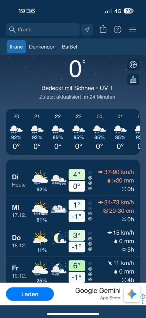 Nach unserer Ankunft bin ich noch eine kleine Runde mit Leo gegangen. Einen Teil davon durch den Flecken ( schwäbisch = Dorf ) und ein wenig auf einem matschigen Feldweg. Ohne Licht war dieser Abschnitt dann etwas doof 🤪.