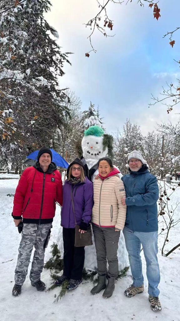 Zum Frühstück hatte ich, während Xiangyang und Leo Gassi waren, den Frühstückstisch soweit als möglich etwas Weihnachtlich dekoriert. Anstelle von Tannen Zweigen gab es dafür Olivenbaum Zweige und anstelle von Gutzele halt runde kurzgebackene Kekse. Dafür aber einen echten Christstollen den ich schon seit vielen Wochen durch die Welt kutschiere.