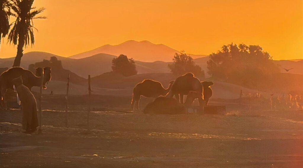 Fotos: Sonnenaufgang beim Desert Camp Porte De Sahara, Seedurchfahrt in Tamellalt, Mittagessen unter Dattelpalmen in Tinejdad, Gassirunde wieder über 1000 Metern und Übernachten unter Dattelpalmen.