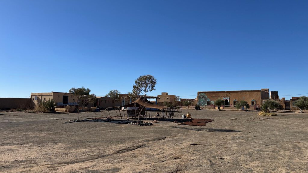 Dieses Camp liegt direkt an den ersten Dünen der Sahara. Es ist trotzdem noch ohne Allrad zu erreichen. Allerdings über eine Mischung aus Schotter, Wellblech und kleinen Sandabschnitten.