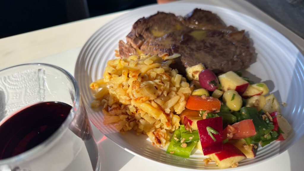 Zum Weihnacht Mittagessen machte ich uns 2 leckere Entrecote Steaks. Auch die hatte ich nun schon wochenlang mit im Kühlschrank spazieren gefahren. Dazu gab es Schweizer Rösti und von Xiangyang einen herrlich erfrischenden gemischten Salat. Natürlich wären Würstchen und Kartoffelsalat für den heutigen Tag angemessener gewesen. Aber beides hatten wir leider nicht zur Hand.