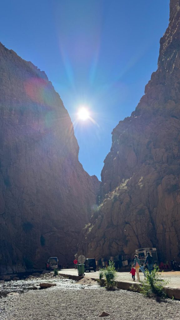 Nach dem Frühstück legten wir die letzten Kilometer nach Tinghir zurück. Dort wurde zuerst bei Shell der Sprinter mit Diesel versorgt und danach wir beim Carrefour Supermarkt. Die Vorräte wieder aufgefüllt ging es dann wieder durch Tinghir in die Todra Schlucht. Die Straße ist easy zu fahren, jedoch sind etliche Touristenbusse unterwegs welche immer wieder bei irgendwelchen Ständen anhalten damit Ihre Gäste fleißig Souvenirs kaufen. So zieht sich das die ganze Strecke, welche stetig aber nicht besonders steil bergauf geht bis in die eigentliche Todra Schlucht.