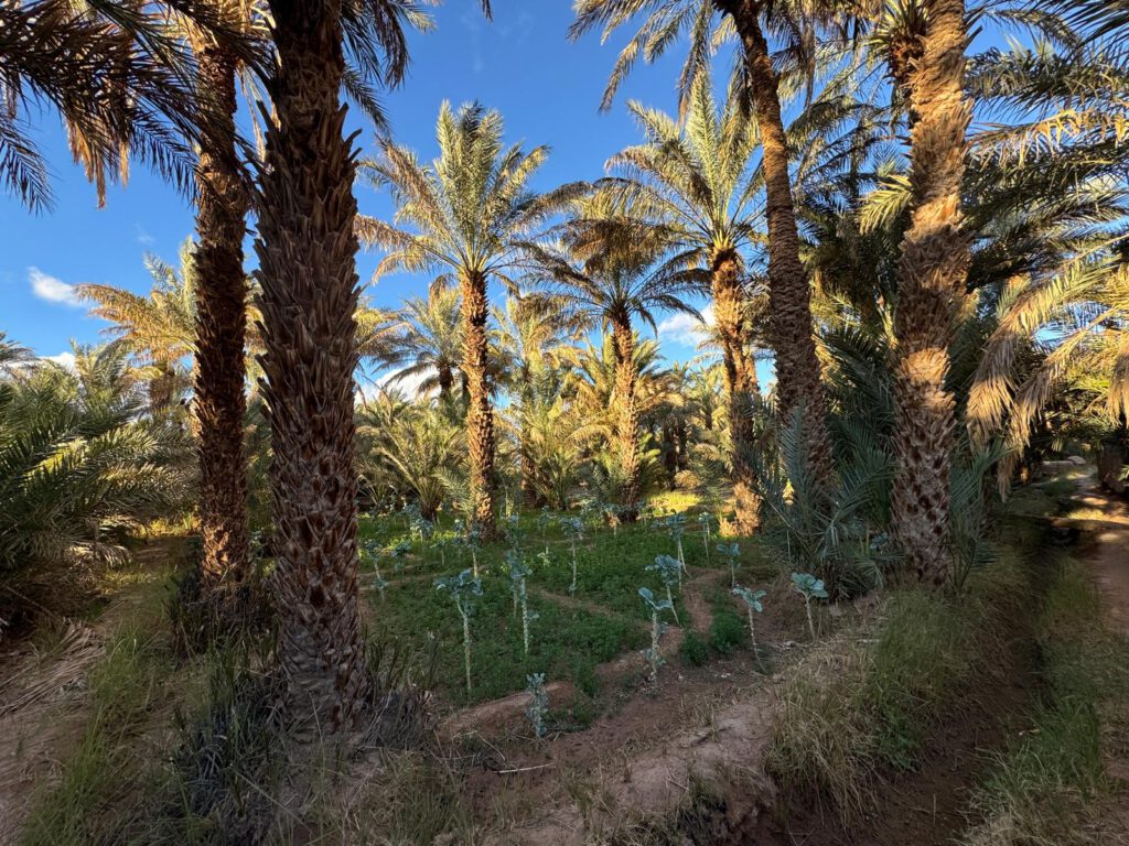 Kurz nach der Stadtgrenze bogen wir von der Hauptstraße ab und fuhren über eine enge etwas abenteuerliche Straße zum „Museum des Oasis“, und dem Restaurant Ksar Elkhorbat in Tinejdad. Hier hatten wir tatsächlich einen Volltreffer bei der Auswahl dieses Ortes getroffen. Das Restaurant lag toll in einer traditionellen Kasbar mitten in einer Oase, bei schönstem Sonnenschein, windgeschützt konnten wir im Freien unter Dattelpalmen lecker Mittagessen.